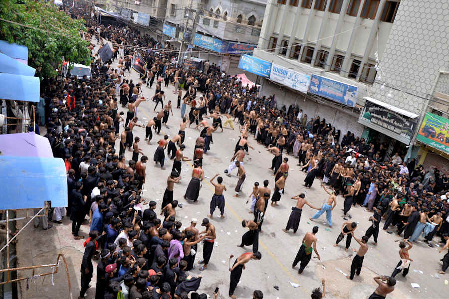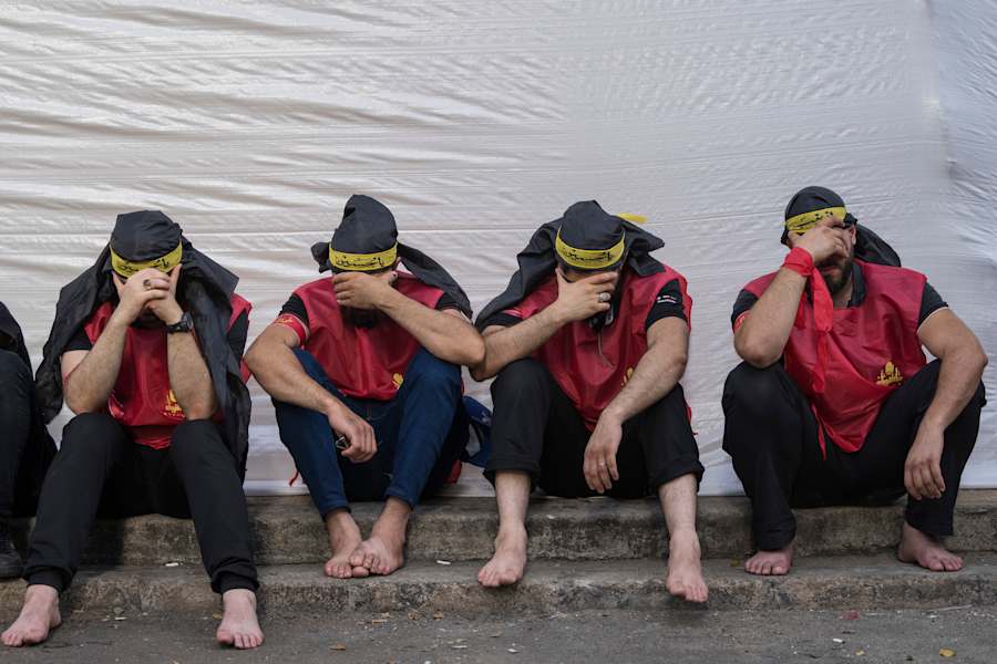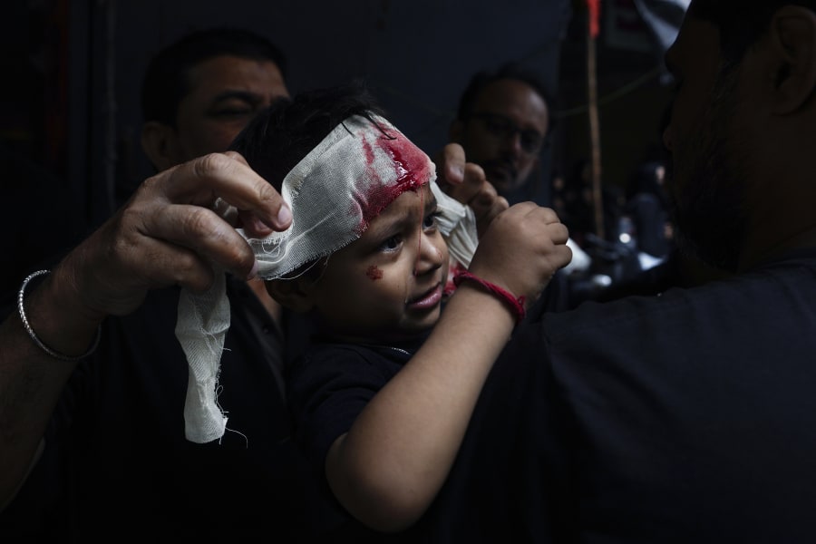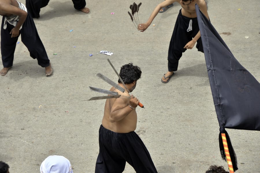 In the streets, young men clad in black and white slashed their heads with swords and knives to demonstrate their grief. Friends swabbed each other’s heads with tissues and handed each other water.