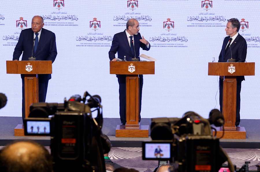 After an afternoon of talks with Egyptian, Jordanian, Saudi, Qatari and Emirati diplomats and a senior Palestinian official, Blinken stood side by side at a line of podiums with his counterparts from Jordan and Egypt to discuss what he said was their shared desire to protect civilians in Gaza and improve aid flows to the besieged territory.