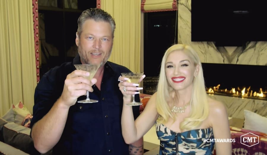In this video image provided by CMT, Blake Shelton, left, and Gwen Stefani toast as they accept the collaboration of the year award for Nobody But You during the Country Music Television awards airing on Wednesday, Oct. 21, 2020. (CMT via AP)