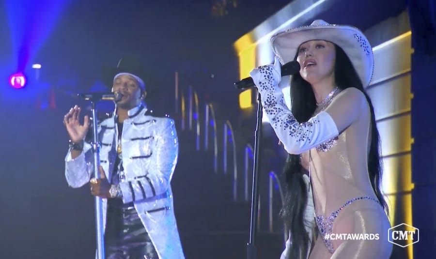 In this video image provided by CMT, Jimmie Allen, left, and Noah Cyrus perform "This Is Us" during the Country Music Television awards airing on Wednesday, Oct. 21, 2020. (CMT via AP)