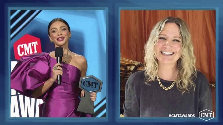 In this video image provided by CMT, Sarah Hyland, left, presents Jennifer Nettles the CMT Equal Play Award during the Country Music Television awards airing on Wednesday, Oct. 21, 2020. (CMT via AP)