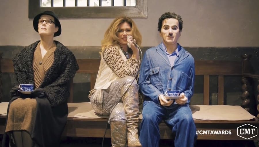 In this video image provided by CMT, Shania Twain, center, perform "Whose Bed Have Your Boots Been Under" during the Country Music Television awards airing on Wednesday, Oct. 21, 2020. (CMT via AP)