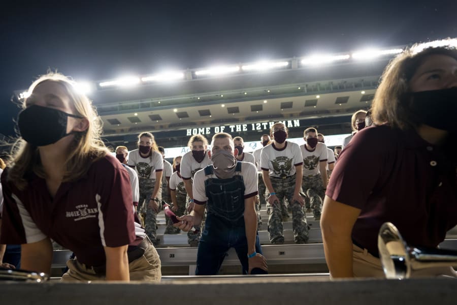 Texas A&M University Yell Leader Jacob Huffman takes a knee while looking over the empty stands at Kyle Field in College Station, Texas during the first Midnight Yell Practice this season early Saturday, Sept. 26, 2020. Due to Coronavirus restrictions, the Texas A&M Band were the only crowd allowed in the normally packed stands for the traditional game day event in College Station, Texas. (Sam Craft/Pool Photo via AP)