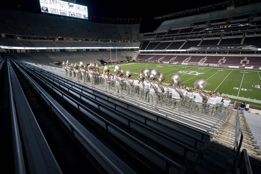 Members of the Texas A&M Corps of Cadets Band practice yells inside of Kyle Field as part of the first Midnight Yell Practice this season in College Station, Texas early Saturday, Sept. 26, 2020. Due to Coronavirus restrictions, the band was the only crowd allowed in the normally packed stands for the traditional game day event in College Station, Texas. (Sam Craft/Pool Photo via AP)