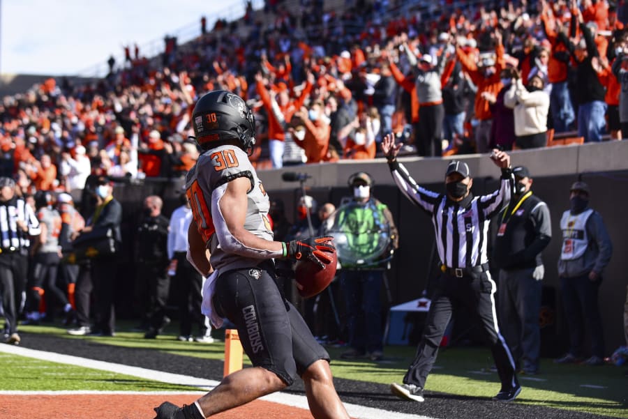 Chuba Hubbard (30) scores a touchdown during the first half of an NCAA college football game against Iowa State Saturday, Oct. 24, 2020, in Stillwater, Okla. (AP Photo/Brody Schmidt)