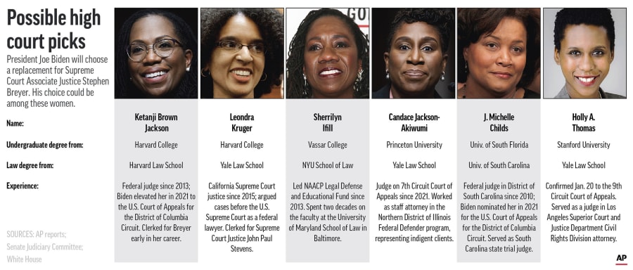 Biden has pledged to nominate the first Black woman to the court, making it politically harder for Republicans to oppose a historic pick. And he said at Breyer’s official announcement on Thursday that he’ll talk to GOP senators before making his decision by the end of February.