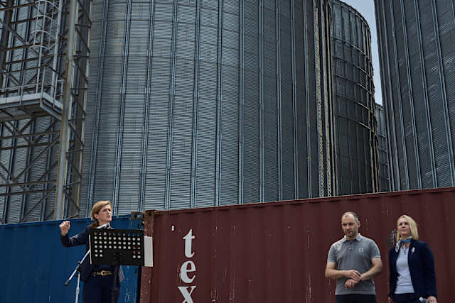 U.S. Agency for International Development Administrator Samantha Power speaks during a news conference at the Port of Odesa, as she is joined by Ukrainian Minister of Infrastructure Oleksandr Kubrakov, center, and U.S. Ambassador to Ukraine Bridget Brink, right, in Odesa, Ukraine, Tuesday, July 18, 2023. (AP Photo/Libkos) (Libkos, Copyright 2023 The Associated Press. All rights reserved.)