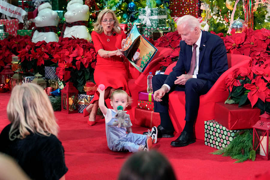 The president and first lady visited privately with patients and their families for photos at Children's National Hospital before Jill Biden read "'Twas the Night Before Christmas" to a group of patients in the atrium. As she read, the president, seated beside her in a matching red chair, played a game of catch with the toddler. Biden made faces at the child and at one point briefly got him to sit up on his chair.