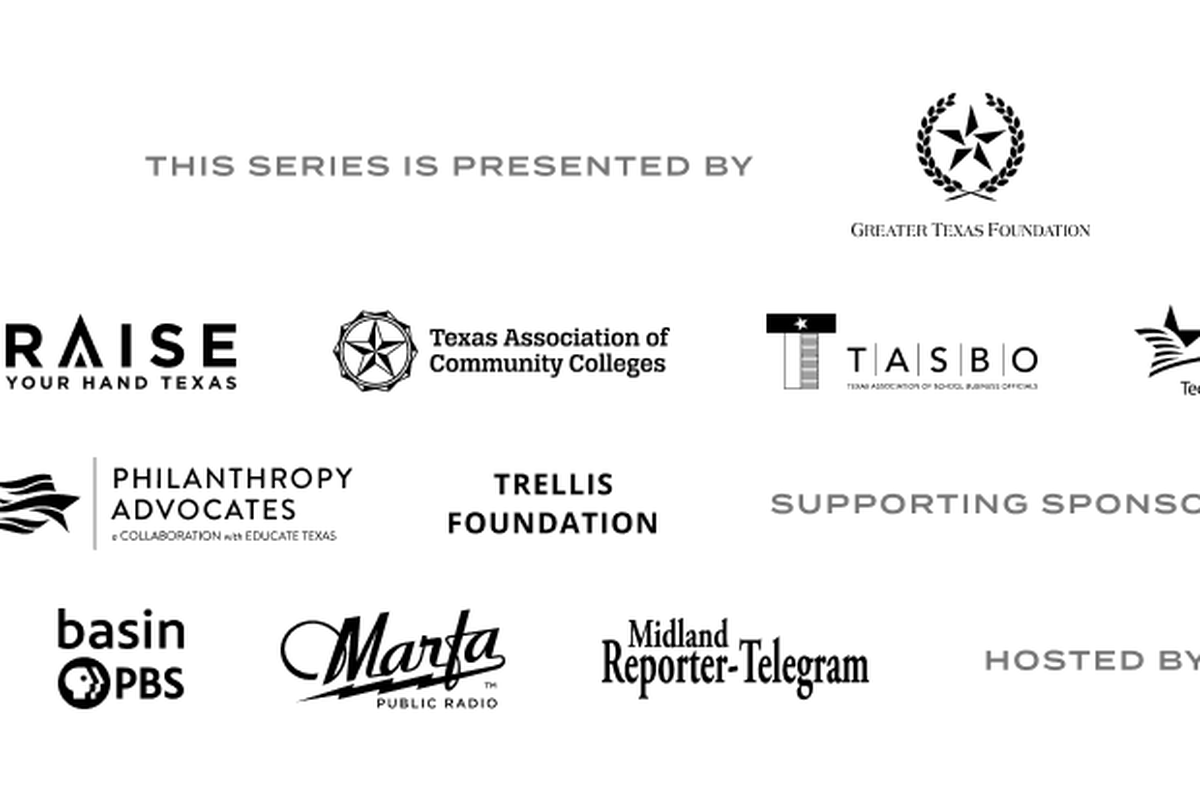 Sponsors help make our events possible. Thank you to Greater Texas Foundation, Raise Your Hand Texas, Texas Association of Community Colleges, Texas State Technical College, TEXAS 2036, Educate Texas, Philanthropy Advocates, Texas Association of School Business Officials, Trellis Foundation and Open Campus for supporting this event and Odessa College for hosting this event. Media support is provided by Marfa Public Radio, Basin PBS and Midland Reporter-Telegram.