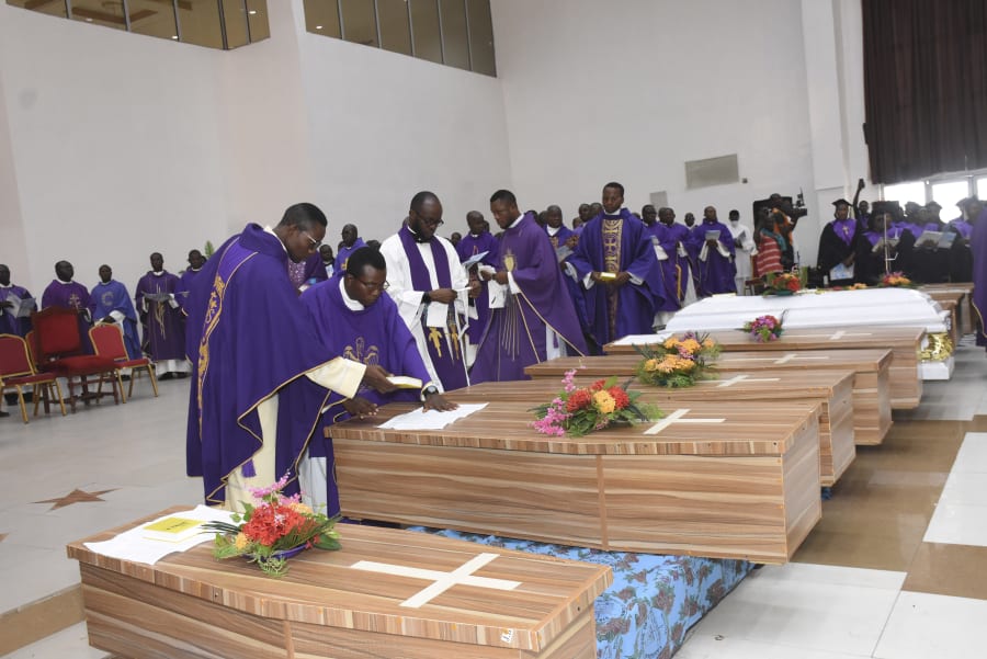 The sight of their coffins, dotted with flowers and lined in front of a large crowd, drew anger and tears from church members, locals, officials and many Nigerians who followed the service on social media.