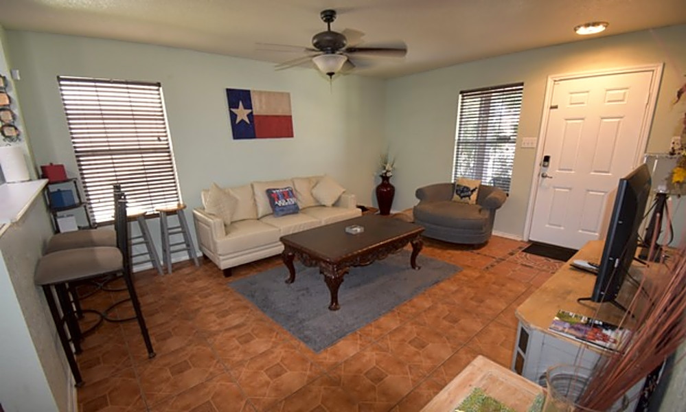 Listed at $1,350/month, this 1,392-square-foot three-bedroom, two-and-a-half-bathroom unit is located at 8331 Cenizo Pass.