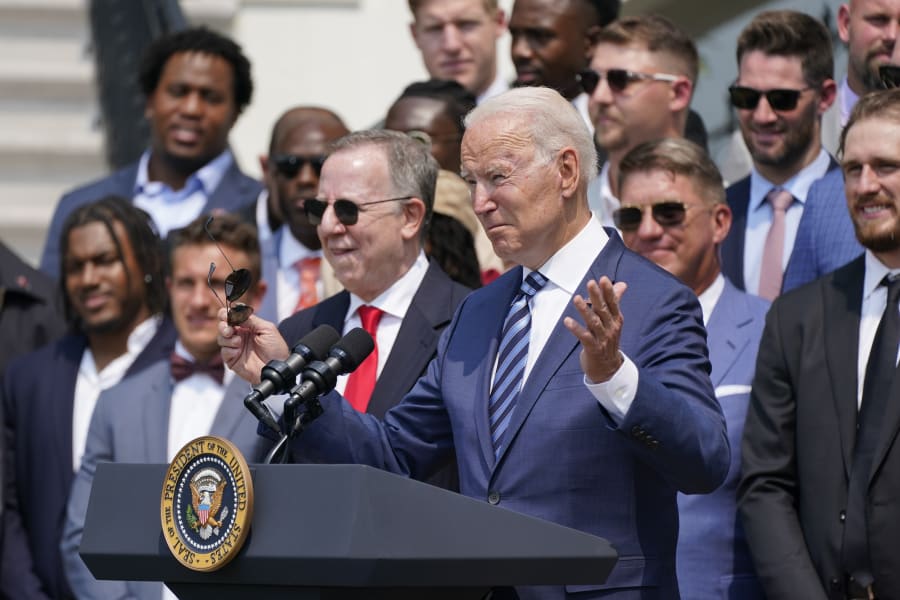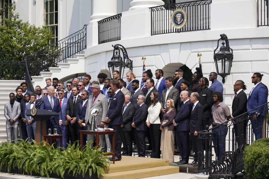Biden was presented with the traditional gift of a No. 46 jersey — which Glazer said was appropriate since Tampa Bay is heading into its 46th season as a franchise. With the sun beating down in the late morning, Biden told players to take their suit jackets off following a group picture, but those in attendance next to the Lombardi Trophy didn't mind.
