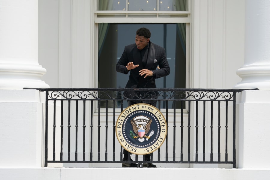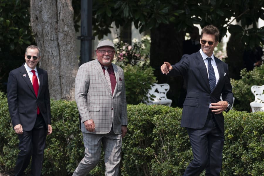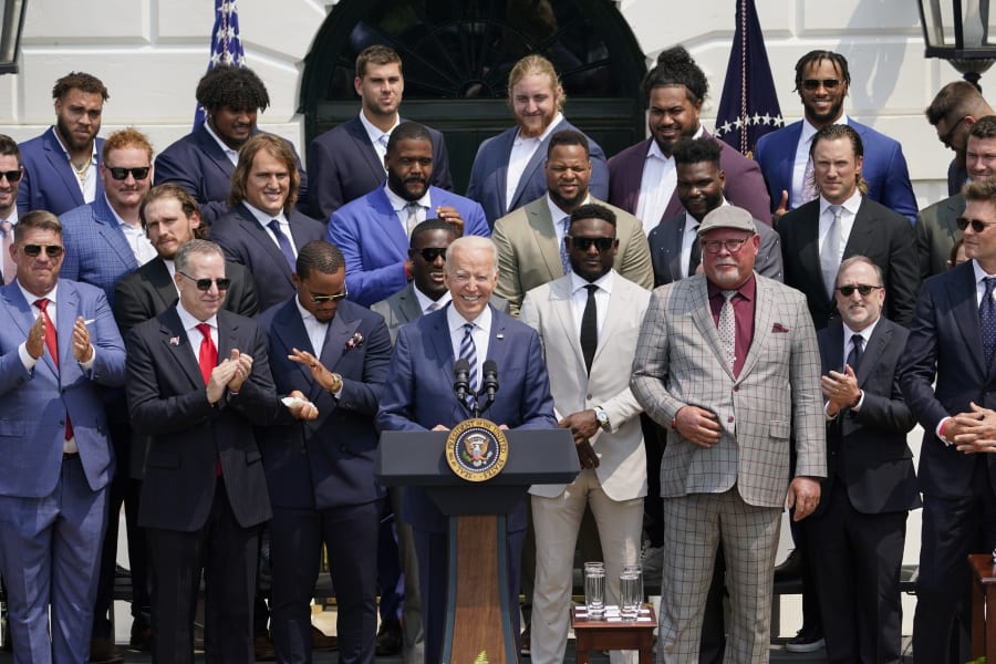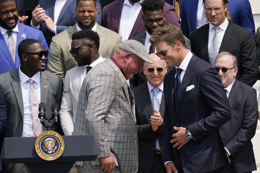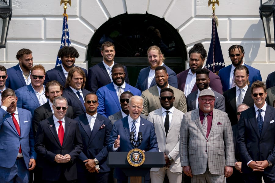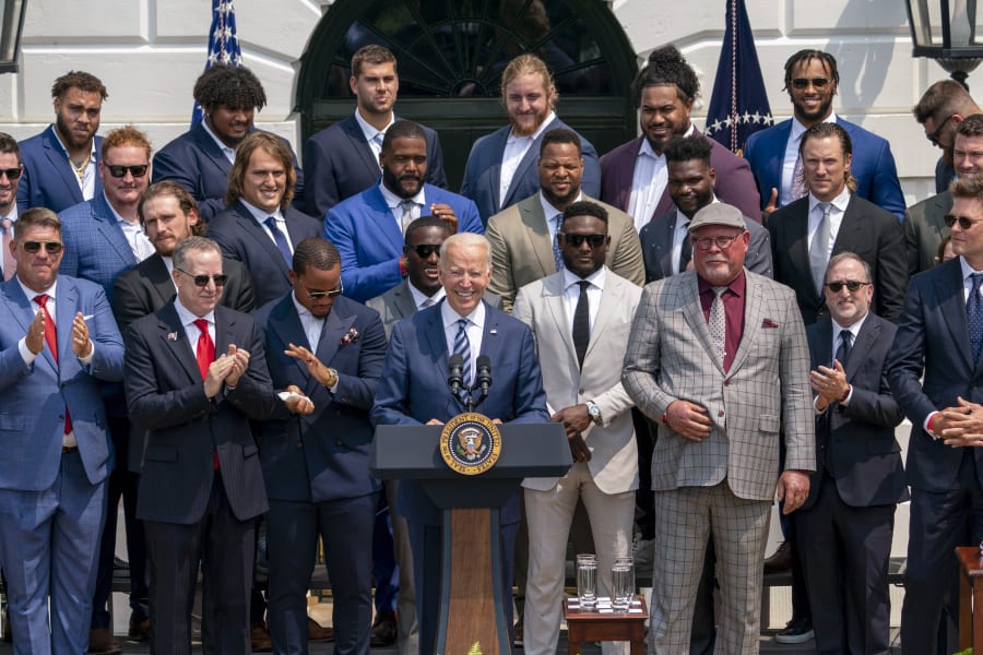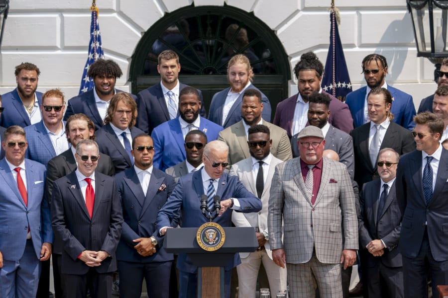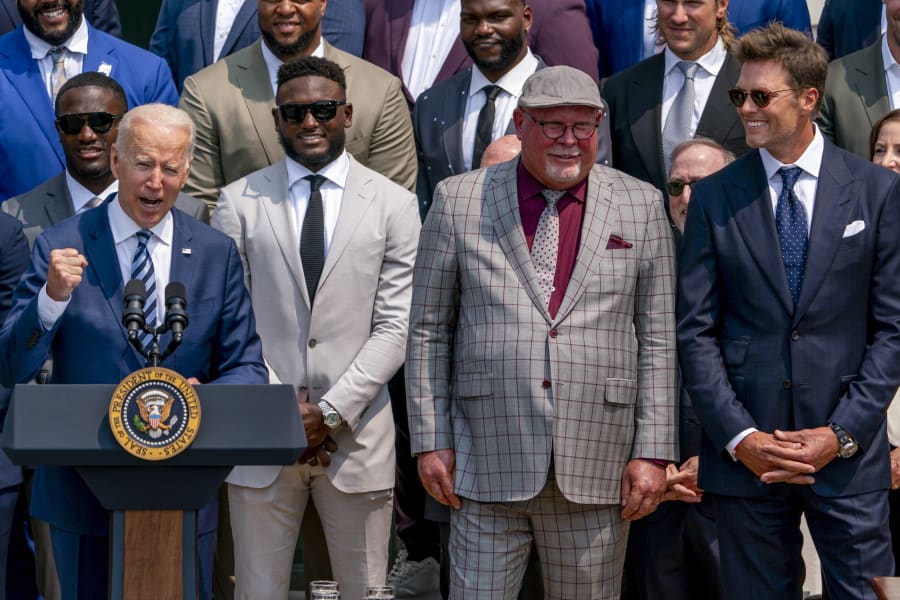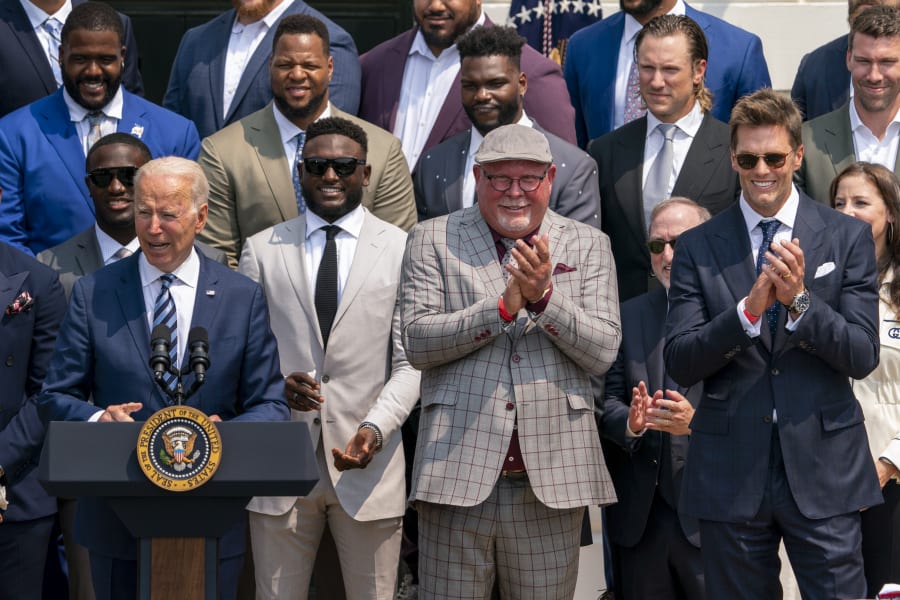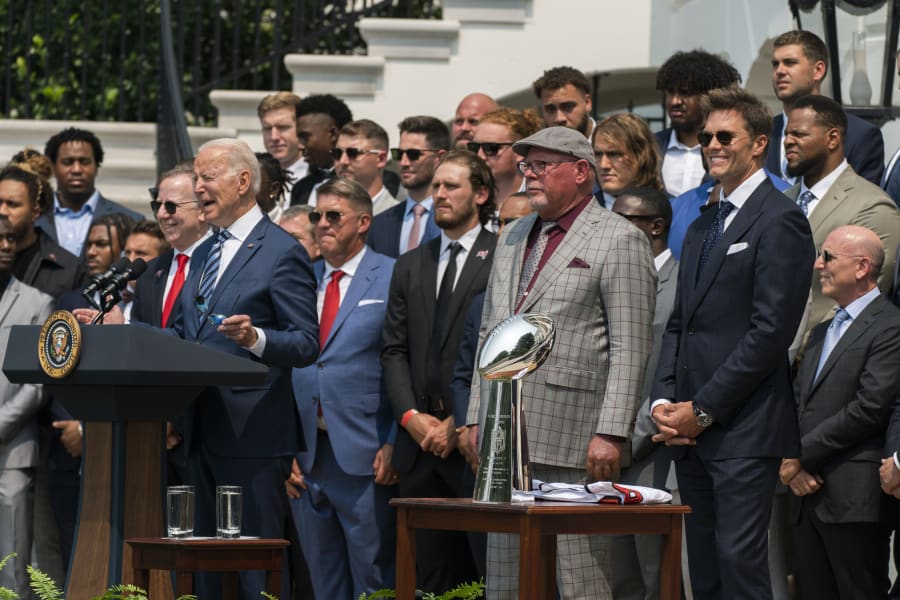 Brady was front and center this time, one of 42 Bucs players accompanying Biden, coach Bruce Arians and owner Bryan Glazer to the ceremony, which included more than just his jokes. There was some pointed political commentary from Arians and a push from the president for players to get vaccinated against the coronavirus if they hadn’t already.