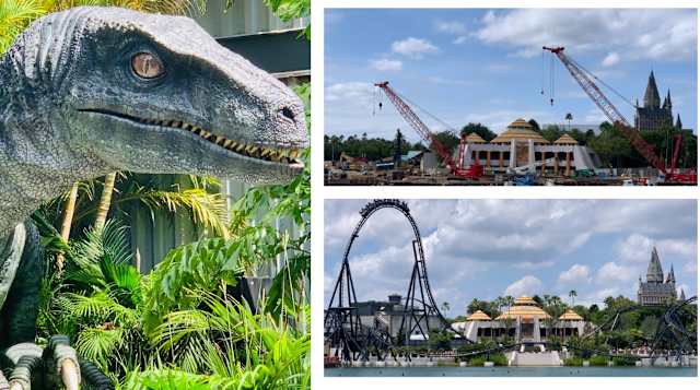 In August, construction crews reached a major milestone with the completion of the coaster’s 155-foot “top hat” element. During the month, guests were stopped in their tracks as giant velociraptor statues were lifted, and sometimes rolled, into the construction site.