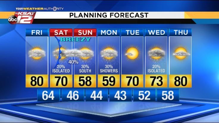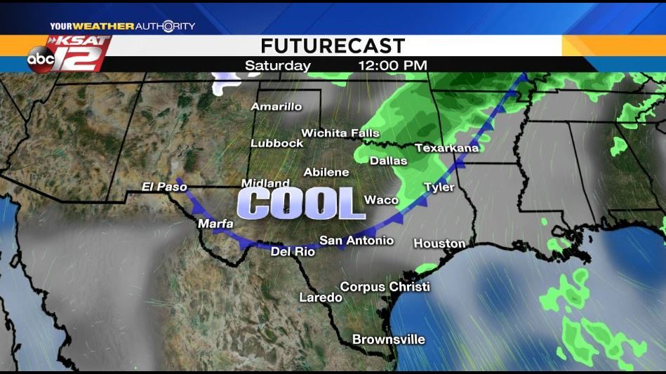 We started the month on a cold note and we are going to end with some unseasonably cool weather.    A cold front is scheduled to arrive midday Saturday, bringing cooler air, gusty winds and a chance for rain.  We are not expecting heavy rainfall with this system and the best chances of rain through Sunday will remain south of San Antonio.